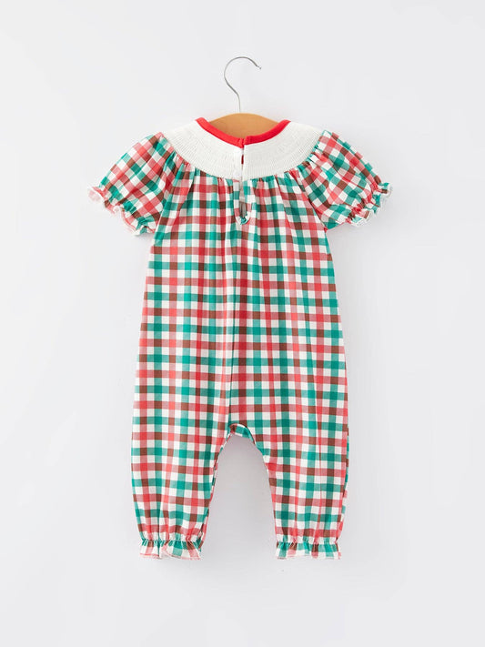 Christmas Santa Claus Smocking Green Plaid Embroidery Baby Girls Romper