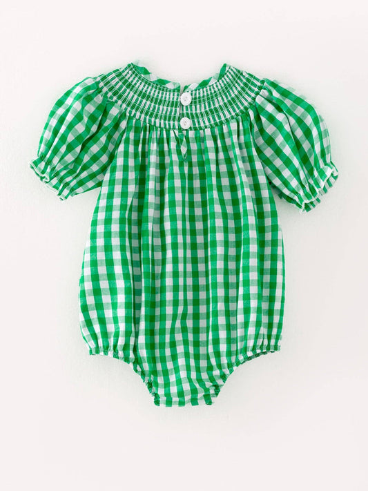 Christmas Santa Claus Smocking Green Plaid Embroidery Baby Girls Romper